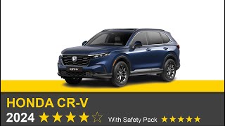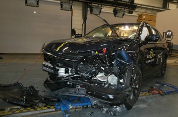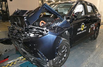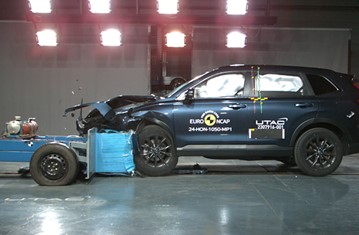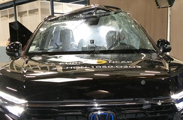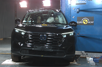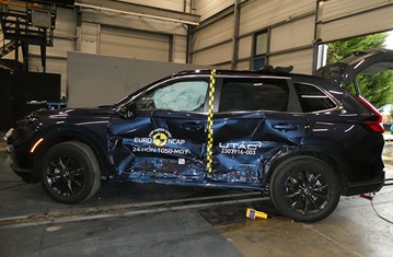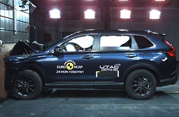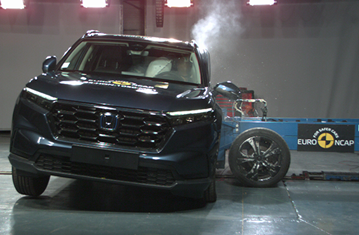 The passenger compartment of the CR-V remained stable in the frontal offset test. Dummy numbers showed good protection of the knees and femurs of both the driver and passenger. Honda showed that a similar level of protection would be provided to occupants of different sizes and to those sitting in different positions. Protection was good for all critical body areas of the passenger, and good or adequate for the driver. Analysis of the deceleration of the impact trolley during the test, and of the deformable barrier after the test, revealed that the CR-V would be a moderately benign impact partner in a frontal collision. In the full-width rigid barrier test, protection of all critical body areas was good for the driver, and good or adequate for the rear passenger. In both the side barrier test and the more severe side pole impact, dummy readings indicated good protection of all critical body areas and the CR-V scored maximum points in this part of the assessment. Control of excursion (the extent to which a body is thrown to the other side of the vehicle when it is hit from the far side) was adequate. The CR-V has a centre airbag mounted on the driver’s seat to mitigate against occupant to occupant injuries in such impacts. Dummy numbers were good in Euro NCAP's test, with equal protection to the front driver and passenger. However, a penalty was applied because analysis showed that the front seat occupants’ heads could sometimes get very close to contacting one another. Tests on the front seats and head restraints demonstrated good protection against whiplash injuries in the event of a rear-end collision. A geometric analysis of the rear seats also indicated good whiplash protection. The CR-V has an advanced eCall system which alerts the emergency services in the event of a crash. The car also has a system which applies the brakes after an impact, to avoid secondary collisions. Honda demonstrated that if the car entered water the doors, if locked, could be opened within two minutes of power being lost but not that electric windows would remain functional long enough to allow occupants to escape.
