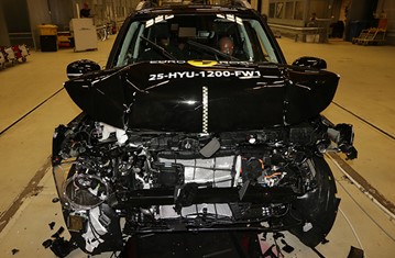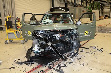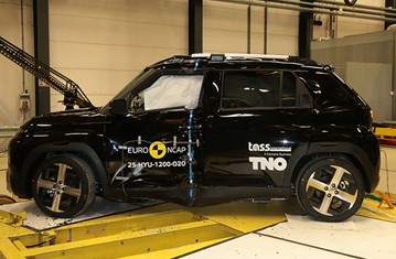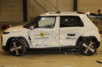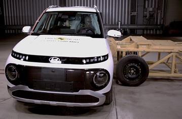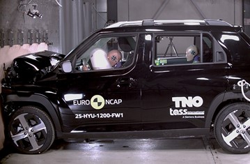 The passenger compartment of the Hyundai INSTER remained stable in the frontal offset test. The driver’s head ‘bottomed out’ the airbag and a penalty was applied to the protection of this part of the body. Chest protection was rated as marginal, based on dummy readings of compression. Dummy readings indicated good protection of the knees and femurs of both the driver and the front seat passenger. Hyundai showed that a similar level of protection would be provided to occupants of different sizes and to those sitting in different positions. Analysis of the deceleration of the impact trolley during the test, and analysis of the deformable barrier after the test, revealed that the Hyundai INSTER would be a benign impact partner in a frontal collision. In the full-width rigid barrier test, protection was rated as marginal for the chest of the driver and that of the rear passenger, based on dummy readings of compression. In the side barrier test, good or adequate protection was provided to all critical body areas. However, the driver door was found to be unlatched after the test, and the score was penalised. In the more severe side pole impact, dummy readings of rib compression indicated marginal protection of the chest. Control of excursion (the extent to which a body is thrown to the other side of the vehicle when it is hit from the far side) was found to be weak The Hyundai INSTER has a countermeasure to mitigate against occupant-to-occupant injuries in such impacts. Dummy readings during the test were good, but the car was precluded from scoring points for its far-side protection because of the door-opening in the side barrier test. Tests on the front seats and head restraints demonstrated good protection against whiplash injuries in the event of a rear-end collision. A geometric analysis of the rear seats indicated marginal whiplash protection. The car has an advanced eCall system which alerts the emergency services in the event of a crash, and a system to prevent secondary impacts after the car has been in a collision. Hyundai demonstrated that the doors and windows would be openable to allow occupants to escape in the event of vehicle submergence.