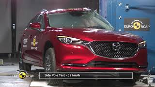 The passenger compartment of the Mazda 6 remained stable in the frontal offset test. Dummy readings showed good protection of all critical body areas for the passenger and good protection for the knees and femurs of both the driver and passenger. Mazda showed that a similar level of protection would be provided to occupants of different sizes and to those sitting in different positions. In the full-width rigid barrier test, protection of the driver dummy was good for all critical body areas. Protection of the rear passenger was good or adequate but the pelvis slipped beneath the lap section of the seatbelt, behaviour that was penalised, and the rating for this body area was rated as poor. In both the side barrier and the more severe side pole impacts, protection of all critical body areas was good and the Mazda 6 scored maximum points in these tests. Tests on the front seats and head restraints demonstrated good protection against whiplash injury in the event of a rear-end collision. A geometric assessment of the rear seats also indicated good whiplash protection. The standard-fit autonomous emergency braking (AEB) system scored maximum points in tests of its functionality at the low speeds, typical of city driving, at which many whiplash injuries are caused.