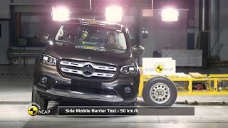 The passenger compartment of the X-Class remained stable in the frontal offset test. Dummy readings showed good protection of the knees and femurs of the driver and passenger. Mercedes-Benz demonstrated that a similar level of protection would be provided to occupants of different sizes and to those sat in different positions. In the full-width rigid barrier test, protection of the driver and rear passenger was good or adequate for all critical parts of the body. In the side barrier impact, protection of all critical body areas was good. Even in the more severe side pole test, protection of the chest was adequate and that of other parts of the body was good. Tests on the front seats and head restraints demonstrated good protection against whiplash protection in the event of a rear-end collision. However, a geometric assessment of the rear seats indicated poor whiplash protection. The standard-fit autonomous emergency braking system scored maximum points in tests of its functionality at the low speeds, typical of city driving, at which many whiplash injuries are caused.