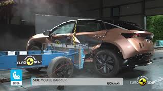 The passenger compartment of the Ariya remained stable in the frontal offset test. Dummy readings indicated good protection of the knees and femurs of both the driver and passenger. Nissan demonstrated that a similar level of protection would be provided to occupants of different sizes and to those sitting in different positions. Analysis of the deceleration of the impact trolley during the test, and analysis of the deformable barrier after the test, revealed that the Ariya would be a moderately benign impact partner in a frontal collision. In the full-width rigid barrier test, protection of the rear passenger’s chest was rated as marginal, based on measured values of dummy chest compression but protection was otherwise good or adequate. In the side barrier test, protection of all critical body areas was good or adequate. In the more severe side pole impact, protection of the chest was rated as marginal, based on readings of dummy rib compression. Control of excursion (the extent to which a body is thrown to the other side of the vehicle when it is hit from the far side) was found to be marginal. The Ariya has a counter-measure to mitigate against occupant to occupant injuries in such impacts. The system performed well in Euro NCAP’s test, with good protection of occupants’ heads. Tests on the front seats and head restraints demonstrated good protection against whiplash injuries in the event of a rear-end collision. A geometric analysis of the rear seats also indicated good whiplash protection. The Ariya has an advanced eCall system which alerts the emergency services in the event of a crash but it lacks a system to prevent secondary collisions in the event of an accident.