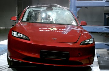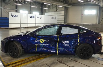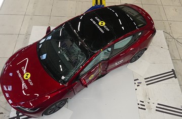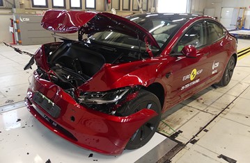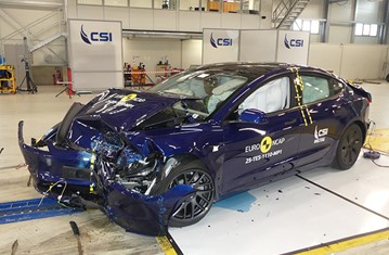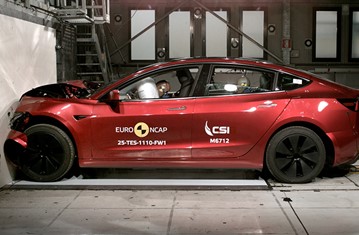 The passenger compartment of the Tesla Model 3 remained stable in the frontal offset test. Dummy readings indicated good protection of the knees and femurs of both the driver and the front seat passenger. Tesla demonstrated that a similar level of protection would be provided to occupants of different sizes and to those sitting in different positions. Analysis of the deceleration of the impact trolley during the test, and analysis of the deformable barrier after the test, revealed that the Tesla Model 3 would be a moderately benign impact partner in a frontal collision. In the full-width rigid barrier test, protection of the chest of the rear seat occupant was rated as marginal, based on dummy readings of compression. Protection was good for all critical body regions for the driver. In both the side barrier test and the more severe side pole impact, good protection was provided to all critical body areas and the Tesla Model 3 scored maximum points in this part of the assessment. Control of excursion (the extent to which a body is thrown to the other side of the vehicle when it is hit from the far side) was found to be adequate The Tesla Model 3 has a countermeasure to mitigate against occupant-to-occupant injuries in such impacts. The airbag performed well in Euro NCAP’s tests with dummy readings indicating good protection for both the driver and passenger. Tests on the front seats and head restraints demonstrated good protection against whiplash injuries in the event of a rear-end collision. A geometric analysis of the rear seats also indicated good whiplash protection. The car has an advanced eCall system which alerts the emergency services in the event of a crash, and a system to prevent secondary impacts after the car has been in a collision. Tesla demonstrated that the doors and windows would be openable to allow occupants to escape in the event of vehicle submergence.